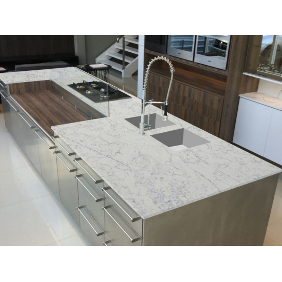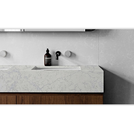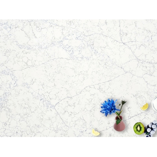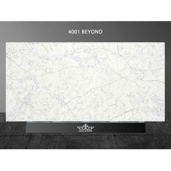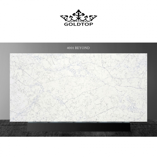 4001 Beyond Marmor Quarzplatte Dieses Quarzmaterial besticht durch seine edle und elegante Optik, inspiriert von der Ästhetik natürlichen Marmors. Der sanfte, helle Grundton wird durch eine feine, fließende Maserung hervorgehoben, die ein harmonisches und gleichzeitig dynamisches Gesamtbild erzeugt. Die Oberfläche wirkt klar und ausdrucksstark und bietet visuelle Tiefe, ohne dabei aufdringlich zu sein. Dieser Quarz verkörpert zeitlose Eleganz und ist somit die ideale Wahl für moderne wie klassische Interieurs. Er verleiht Küchen, Bädern und exklusiven Geschäftsräumen einen Hauch von dezentem Luxus.