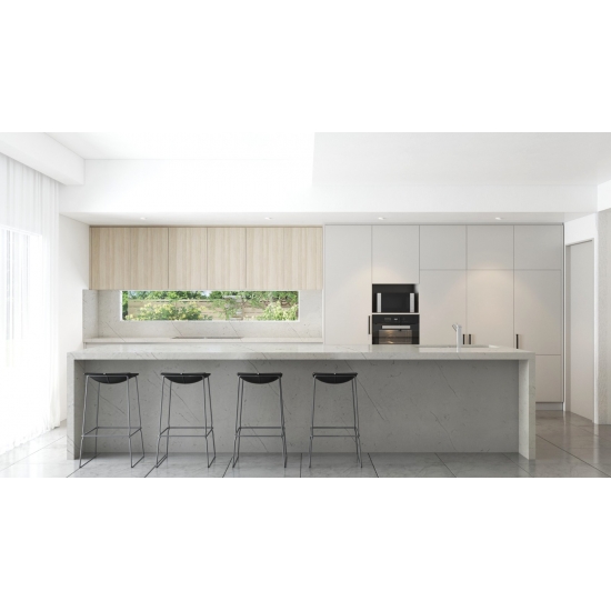4005 Bianca Veno Marmor-Quarzplatte Dieses Quarzmaterial besticht durch eine raffinierte und elegante Ästhetik. Der sanfte weiße Hintergrund wird von zarten, fließenden grauen Adern akzentuiert. Die dezenten, marmorähnlichen Muster erzeugen ein Gefühl von Bewegung und natürlicher Harmonie und verleihen der Oberfläche eine klare und zugleich luxuriöse Ausstrahlung. Dieser Quarz strahlt zeitlose Eleganz aus, vereint Schlichtheit und Charakter und eignet sich ideal, um sowohl moderne als auch klassische Interieurs mit einem hellen, anmutigen und hochwertigen Finish zu verschönern.