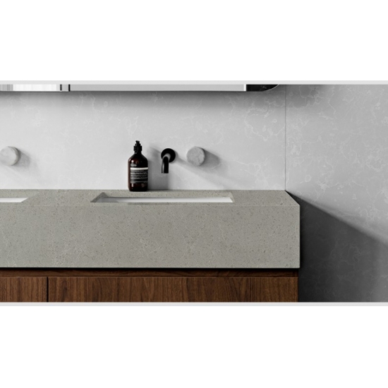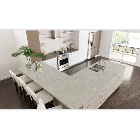 4010 Drizzle Marmor-Quarzplatte Diese Quarzplatte besticht durch ihre edle und elegante Optik mit einem sanften Weißton, der von zarten grauen Adern durchzogen wird. Die dezenten, marmorähnlichen Muster schaffen eine ruhige und luftige Atmosphäre und verleihen Räumen Harmonie und natürliche Dynamik. Dieser Quarz strahlt unaufdringlichen Luxus aus und ist somit die ideale Wahl für Räume, die ein klares, zeitloses und anspruchsvolles Ambiente wünschen.