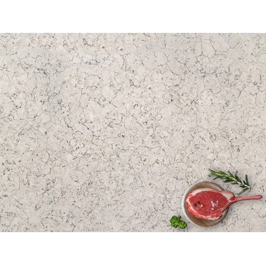 4012 River Crema Marmor-Quarzplatte Diese Quarzplatte besticht durch ihre warme und elegante Optik mit einem sanften, cremefarbenen Grundton, der von zarten, fließenden Adern, inspiriert von natürlichem Marmor, akzentuiert wird. Die Oberfläche verströmt einen raffinierten und zeitlosen Charme, da die feinen Adern subtile Bewegung und Tiefe verleihen, ohne das Gesamtbild zu dominieren. Diese Quarzplatte wurde entworfen, um Räumen Wärme und Eleganz zu verleihen und ist somit die ideale Wahl für private und gewerbliche Interieurs, die eine ausgewogene und luxuriöse Ästhetik anstreben.