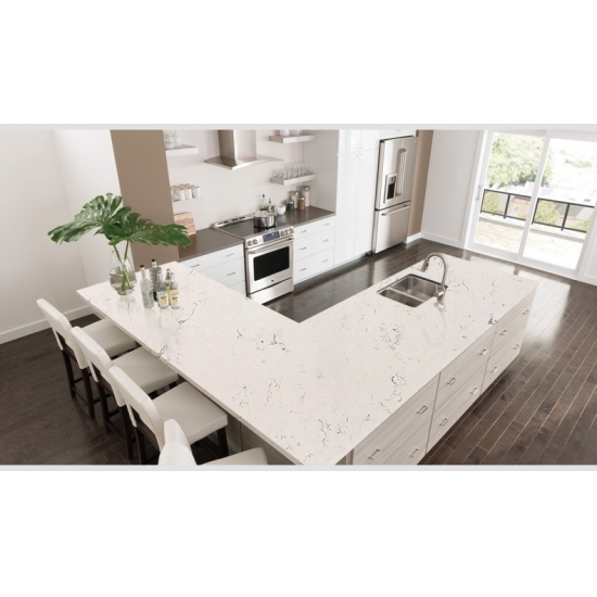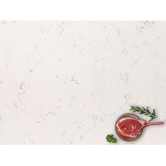 4029 Winky Marmorquarz Diese Quarzplatte besticht durch ihre elegante, edle Optik mit einem sanften Weißton, der von dezenten grauen und beigen Adern durchzogen ist. Die Oberfläche strahlt eine natürliche, zeitlose Schönheit aus, da die sanften Adern ein Gefühl von Harmonie und Raffinesse erzeugen. Diese Quarzplatte wurde entworfen, um jedem Raum einen Hauch von unaufdringlichem Luxus zu verleihen und Arbeitsplatten, Wänden oder besonderen Installationen eine ruhige und anmutige Note zu geben.