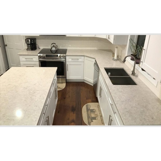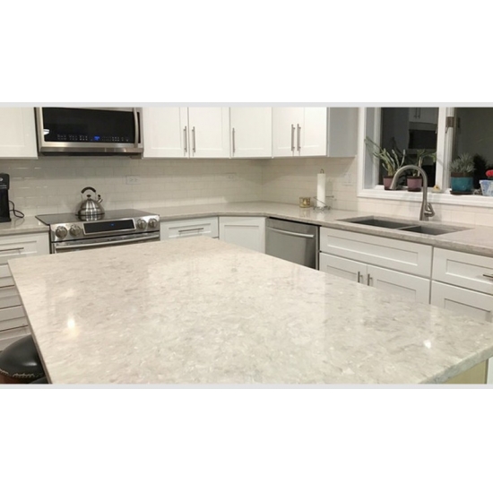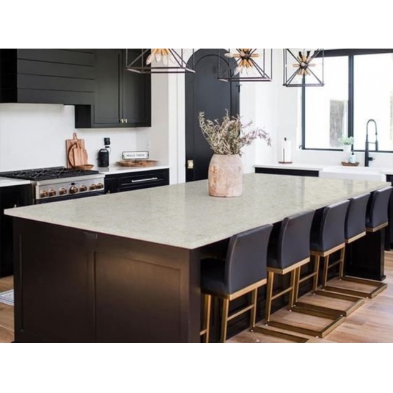 4034 Tellaro Marmorquarz Diese Quarzplatte besticht durch ihre elegante und edle Optik mit einem sanften Weißton, der von feinen grauen Adern durchzogen ist. Die Oberfläche vermittelt ein Gefühl natürlicher Harmonie, da die zarten, marmorähnlichen Muster nahtlos über die Platte fließen und ihr Tiefe und optische Reize verleihen. Dieser Quarzstein wurde entworfen, um jedem Raum, in dem er sich befindet, zeitlose Schönheit und dezenten Luxus zu verleihen und ist somit die ideale Wahl für moderne wie auch klassische Interieurs.