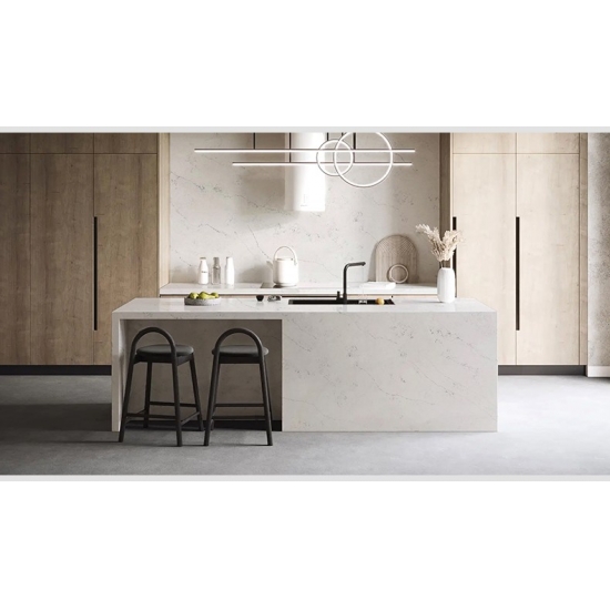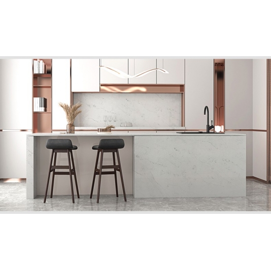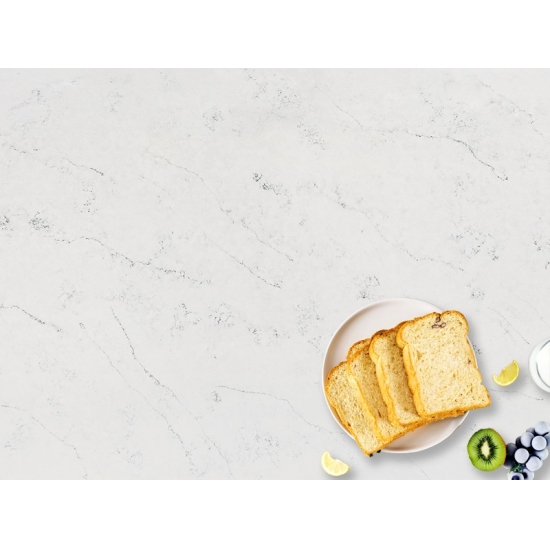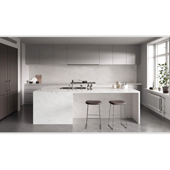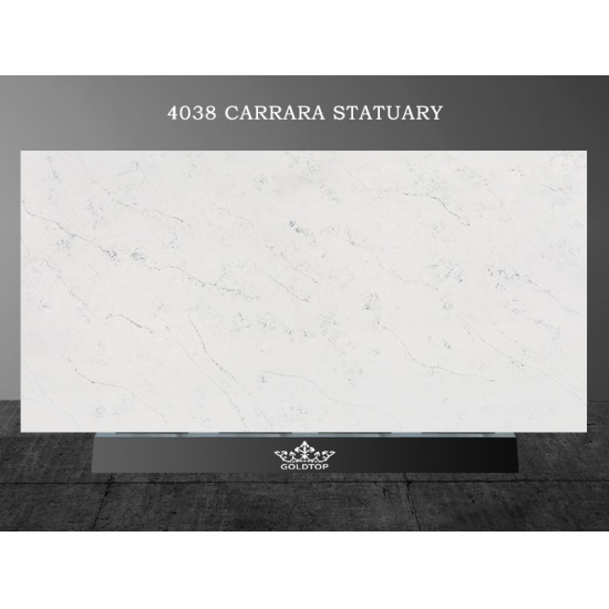 4038 Carrara Statuario Marmor Quarz Diese Quarzplatte besticht durch ihre edle und elegante Optik mit einem sanften weißen Hintergrund, der von anmutigen grauen Adern, inspiriert von natürlichem Statuario-Marmor, akzentuiert wird. Die Oberfläche strahlt zeitlose Eleganz aus, da die feinen Adern sich natürlich über die Platte erstrecken und so ein Gefühl von Bewegung und Tiefe erzeugen. Dieser Quarz verleiht jedem Raum ein helles und luxuriöses Ambiente und ist somit die ideale Wahl für Küchen, Bäder und exklusive Wohn- oder Geschäftsräume.