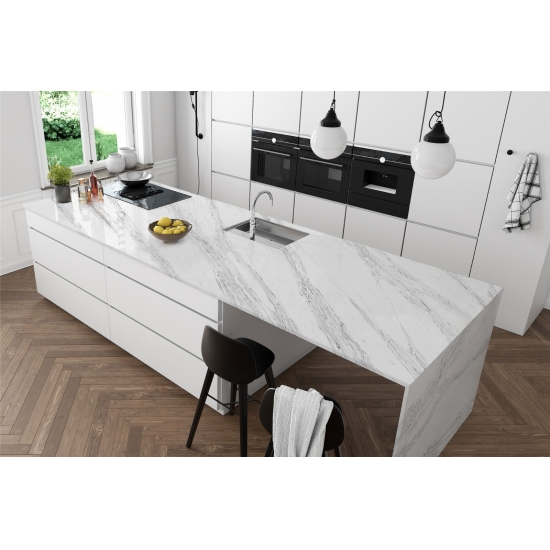 Dieser Quarz eignet sich perfekt für vielfältige Anwendungen, von Arbeitsplatten und Kücheninseln bis hin zu Akzentwänden und Waschtischen. Seine markante Maserung verleiht ihm Charakter und Eleganz und macht ihn zum Blickfang in jedem Design. Ob kombiniert mit edlen Metallic-Tönen oder warmen Holznuancen – der Quarz 5125 Calacatta Fiorina unterstreicht die Eleganz jedes Raumes.