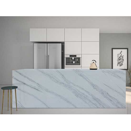 5044 Volakas White Calacatta Quarz eignet sich dank seiner zeitlosen Eleganz und seines vielseitigen Designs ideal für eine Vielzahl von Anwendungen. Dieser polierte Quarz wird häufig für Küchenarbeitsplatten, Waschtische und Fliesenspiegel verwendet, wo seine klare weiße Oberfläche mit sanften grauen Adern für einen Hauch von Raffinesse sorgt. Er ist außerdem perfekt für Wandverkleidungen und Bodenbeläge in Wohn- und Gewerberäumen.