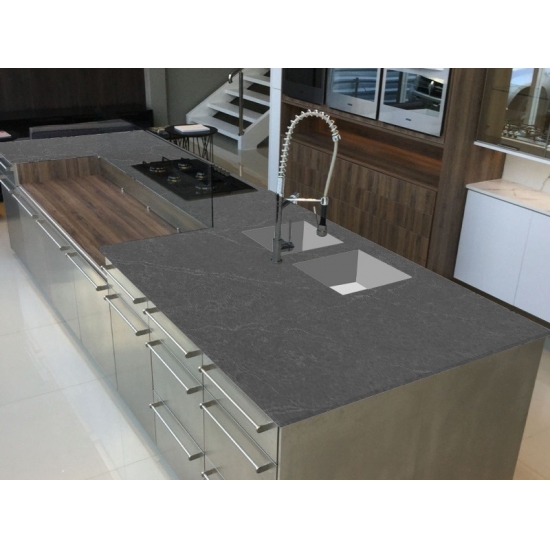5128 Fior Bosco Quarz besticht durch seine edle graue Oberfläche, die von zarten, organischen Adern durchzogen ist und an die friedvolle Schönheit einer Waldlandschaft erinnert. Jede Platte präsentiert sich als einzigartige Komposition aus Farbtiefe und fließender Maserung und verleiht jedem Interieur eine moderne und atmosphärische Ruhe. Die leuchtende Oberfläche verstärkt die Lichtreflexion und erzeugt einen dynamischen visuellen Effekt – ideal für Küchenarbeitsplatten, Waschtische und Akzentwände.