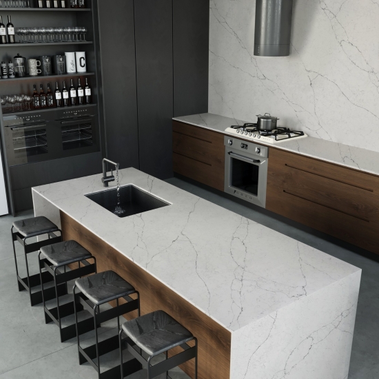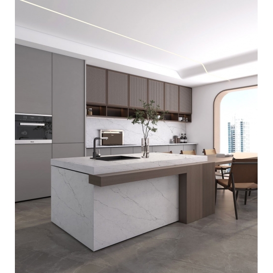 Die Calacatta-Serie ist derzeit das beliebteste Quarzsteinprodukt. Exquisit und einzigartig, besticht Calacatta-Quarz durch sein reines Weiß und die markante, durchgefärbte Marmoroptik. Mit seinem wunderschönen, breiten Adernmuster und der luxuriösen Haptik bietet dieser Quarz die natürliche Optik von Calacatta-Marmor, jedoch ohne dessen Nachteile. Calacatta-Quarz ist eine äußerst robuste, flecken- und kratzfeste Arbeitsplatte und somit eine sehr praktische Wahl für Küchen- und Badezimmerarbeitsplatten, Treppen, Fensterbänke, maßgefertigte Möbel, Wand- und Bodenbeläge im Innen- und Außenbereich, Wasserstrahlschneidtechniken und andere Designprojekte.