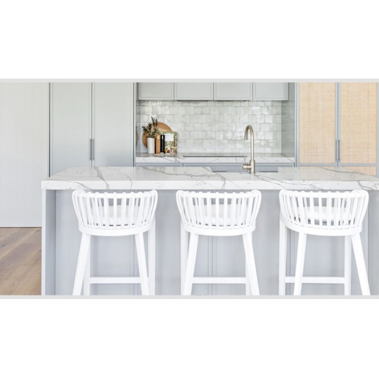Calacatta-Quarz besteht aus natürlichen Bestandteilen, ist aber dennoch robust, langlebig und porenarm, wodurch Steinprodukte aus Quarz nahezu verschleißfrei sind. Langlebigkeit, Komfort und ein gleichmäßiges Muster sind die Hauptgründe für die wachsende Beliebtheit von Quarzstein. Quarzstein besteht zu 90 % aus Naturstein; der Rest sind Bindemittel, Farbstoffe und Zusatzstoffe, die die technischen Eigenschaften des Steins verbessern. Wasserdurchlässigkeit und Fleckenbeständigkeit ergänzen die Schönheit von Quarzstein.