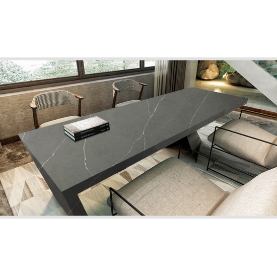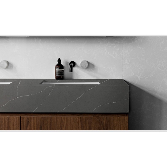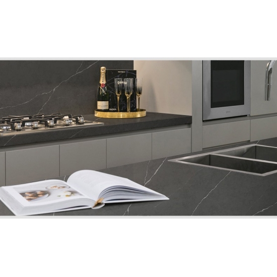 Die Quarzplatte 5032 Temper besticht durch ihren markanten und dynamischen Charakter: Ein tief anthrazitfarbener Grundton wird von intensiven weißen Adern durchzogen. Das kontrastreiche Muster erzeugt eine dynamische und moderne Ausstrahlung. Diese Platte bietet eine starke visuelle Wirkung und eignet sich daher ideal für zeitgenössische und ausdrucksstarke Interieurs. Sie verleiht jedem Raum einen Hauch von dramatischer Eleganz.