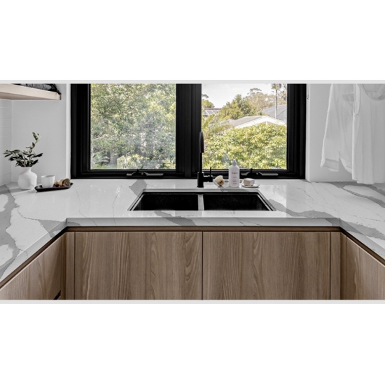 Die Quarzplatte 5033 Ocean Wave besticht durch ihre dynamische und fließende Optik. Der tiefblaue Grundton wird von markanten, weißen Adern durchzogen. Der starke Kontrast erinnert an die Kraft und Eleganz von Meereswellen. Diese Platte setzt ein eindrucksvolles Statement, eignet sich perfekt als Blickfang in modernen Räumen und verleiht jedem Design lebendige Energie und zeitgemäßen Luxus.