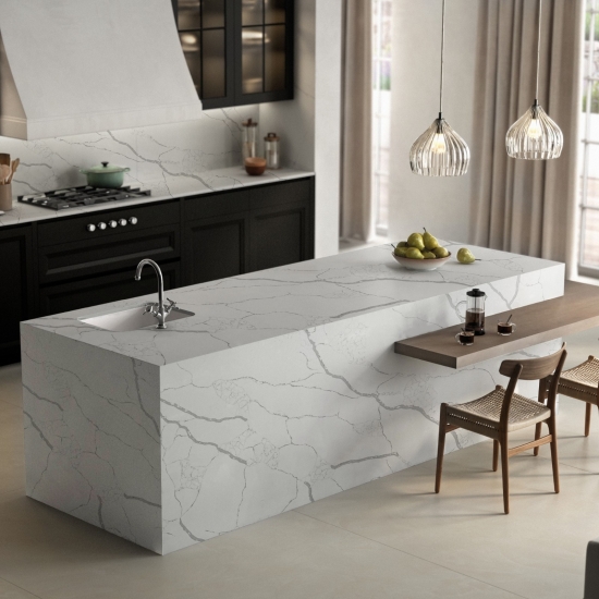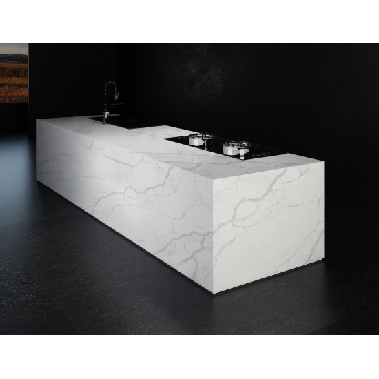 Die Calacatta-Serie ist derzeit das beliebteste Quarzsteinprodukt. Exquisit und einzigartig, besticht Calacatta-Quarz durch sein reines Weiß und die markante, durchgefärbte Marmoroptik. Mit seinem wunderschönen, breiten Adernmuster und der luxuriösen Haptik bietet dieser Quarz die natürliche Optik von Calacatta-Marmor, jedoch ohne dessen Nachteile. Calacatta-Quarz ist eine äußerst robuste, flecken- und kratzfeste Arbeitsplatte und somit eine sehr praktische Wahl für Küchen- und Badezimmerarbeitsplatten, Treppen, Fensterbänke, maßgefertigte Möbel, Wand- und Bodenbeläge im Innen- und Außenbereich, Wasserstrahlschneidtechniken und andere Designprojekte.