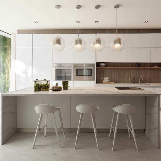 Dieser Quarz eignet sich perfekt für vielfältige Anwendungen, von Arbeitsplatten und Kücheninseln bis hin zu Akzentwänden und Waschtischen. Seine markante Maserung verleiht ihm Charakter und Eleganz und macht ihn zum Blickfang in jedem Design. Ob kombiniert mit edlen Metallic-Tönen oder warmen Holznuancen – der Quarz 5125 Calacatta Fiorina unterstreicht die Eleganz jedes Raumes.