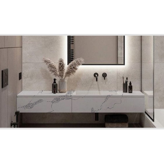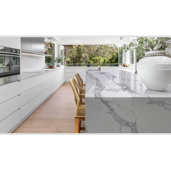 Die Quarzplatte 5046 Nuvo besticht durch eine elegante weiße Basis mit grauer Maserung und bietet eine moderne und einheitliche Ästhetik für großflächige Wohn- und Gewerbeprojekte. Es wurde für Langlebigkeit und Beständigkeit entwickelt und bietet hohe Härte, Fleckenbeständigkeit und kontrollierte Chargenproduktionsstandards – wodurch es sich ideal für die Lieferung großer Mengen und die langfristige Projektzusammenarbeit eignet.