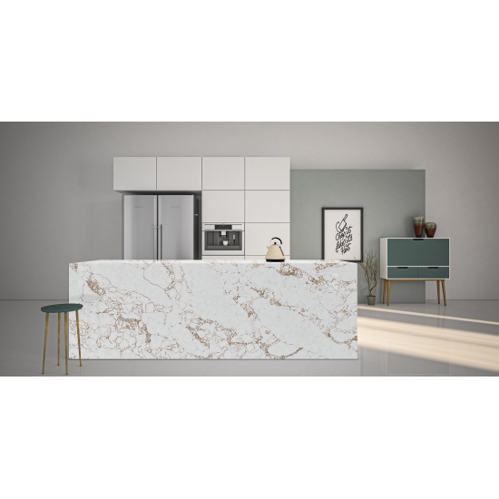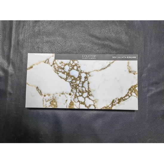 Calacatta-Quarz besteht aus natürlichen Bestandteilen, ist aber dennoch robust, langlebig und porenarm, wodurch Steinprodukte aus Quarz nahezu verschleißfrei sind. Langlebigkeit, Komfort und ein gleichmäßiges Muster sind die Hauptgründe für die wachsende Beliebtheit von Quarzstein. Quarzstein besteht zu 90 % aus Naturstein; der Rest sind Bindemittel, Farbstoffe und Zusatzstoffe, die die technischen Eigenschaften des Steins verbessern. Wasserdurchlässigkeit und Fleckenbeständigkeit ergänzen die Schönheit von Quarzstein.