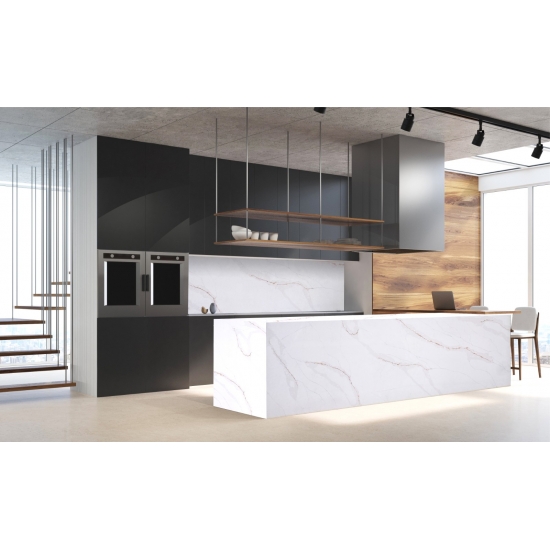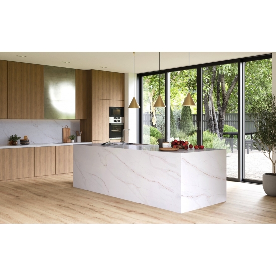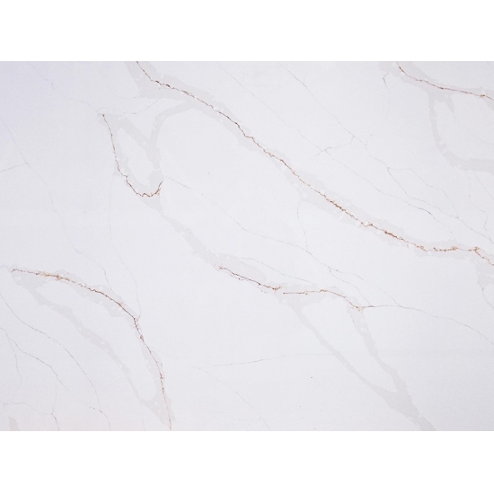 Die Calacatta-Serie ist derzeit das beliebteste Quarzsteinprodukt. Exquisit und einzigartig, besticht Calacatta-Quarz durch sein reines Weiß und die markante, durchgefärbte Marmoroptik. Mit seinem wunderschönen, breiten Adernmuster und der luxuriösen Haptik bietet dieser Quarz die natürliche Optik von Calacatta-Marmor, jedoch ohne dessen Nachteile. Calacatta-Quarz ist eine äußerst robuste, flecken- und kratzfeste Arbeitsplatte und somit eine sehr praktische Wahl für Küchen- und Badezimmerarbeitsplatten, Treppen, Fensterbänke, maßgefertigte Möbel, Wand- und Bodenbeläge im Innen- und Außenbereich, Wasserstrahlschneidtechniken und andere Designprojekte.