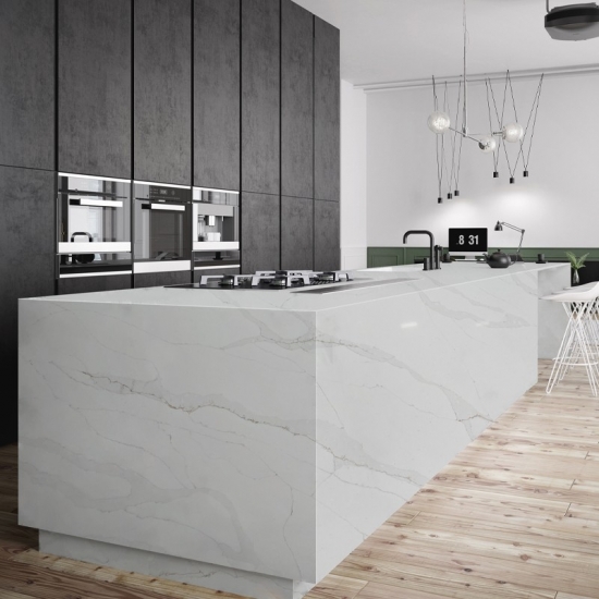 Calacatta-Quarz besteht aus natürlichen Bestandteilen, ist aber dennoch robust, langlebig und porenarm, wodurch Steinprodukte aus Quarz nahezu verschleißfrei sind. Langlebigkeit, Komfort und ein gleichmäßiges Muster sind die Hauptgründe für die wachsende Beliebtheit von Quarzstein. Quarzstein besteht zu 90 % aus Naturstein; der Rest sind Bindemittel, Farbstoffe und Zusatzstoffe, die die technischen Eigenschaften des Steins verbessern. Wasserdurchlässigkeit und Fleckenbeständigkeit ergänzen die Schönheit von Quarzstein.