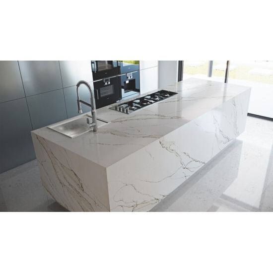 Calacatta Quartz Brittanicca Gold, die Quarzserie Calacatta, ist derzeit das beliebteste Quarzsteinprodukt. Exquisit und einzigartig, besticht Calacatta Quartz durch sein reines Weiß und die markante, durchgehende Marmoroptik.