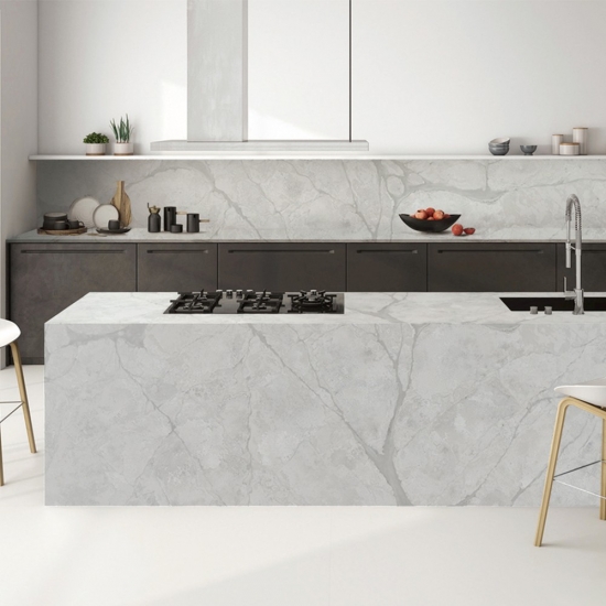 Die Calacatta-Serie ist derzeit das beliebteste Quarzsteinprodukt. Exquisit und einzigartig, besticht Calacatta-Quarz durch sein reines Weiß und die markante, durchgefärbte Marmoroptik. Mit seinem wunderschönen, breiten Adernmuster und der luxuriösen Haptik bietet dieser Quarz die natürliche Optik von Calacatta-Marmor, jedoch ohne dessen Nachteile. Calacatta-Quarz ist eine äußerst robuste, flecken- und kratzfeste Arbeitsplatte und somit eine sehr praktische Wahl für Küchen- und Badezimmerarbeitsplatten, Treppen, Fensterbänke, maßgefertigte Möbel, Wand- und Bodenbeläge im Innen- und Außenbereich, Wasserstrahlschneidtechniken und andere Designprojekte.
