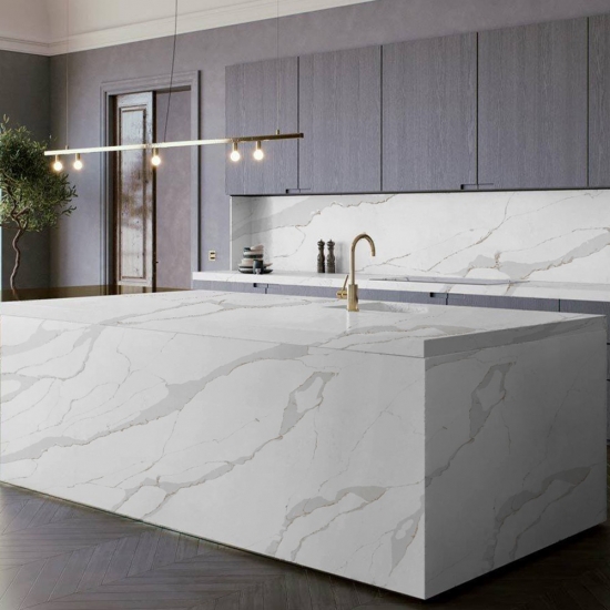 Calacatta-Quarz besteht aus natürlichen Bestandteilen, ist aber dennoch robust, langlebig und porenarm, wodurch Steinprodukte aus Quarz nahezu verschleißfrei sind. Langlebigkeit, Komfort und ein gleichmäßiges Muster sind die Hauptgründe für die wachsende Beliebtheit von Quarzstein. Quarzstein besteht zu 90 % aus Naturstein; der Rest sind Bindemittel, Farbstoffe und Zusatzstoffe, die die technischen Eigenschaften des Steins verbessern. Wasserdurchlässigkeit und Fleckenbeständigkeit ergänzen die Schönheit von Quarzstein.