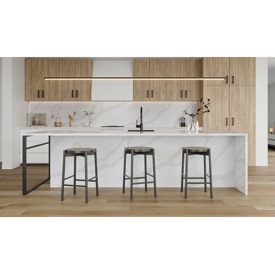 5059 Calacatta Paris Quarz besticht durch eine strahlend weiße Basis mit markanten, ausdrucksstarken grauen Adern. Der eindrucksvolle Kontrast erzeugt eine dynamische und luxuriöse Optik. Diese Platte verkörpert moderne Eleganz und setzt in jedem Interieur stilvolle Akzente.