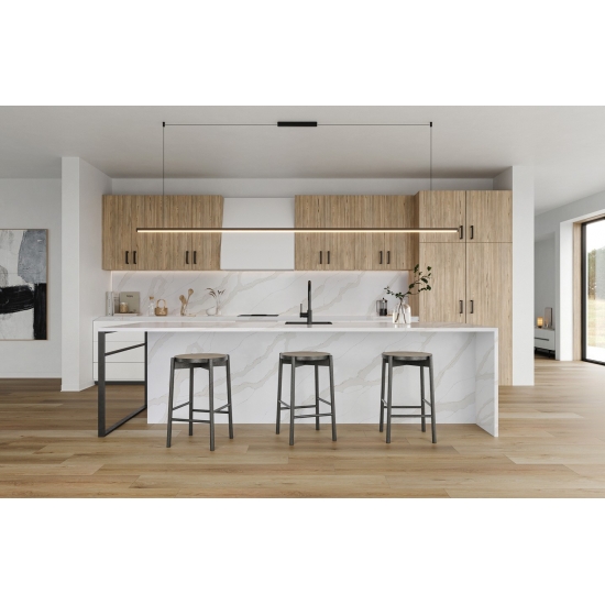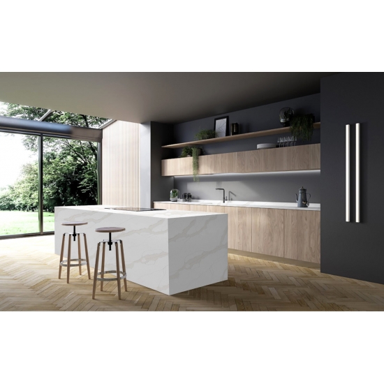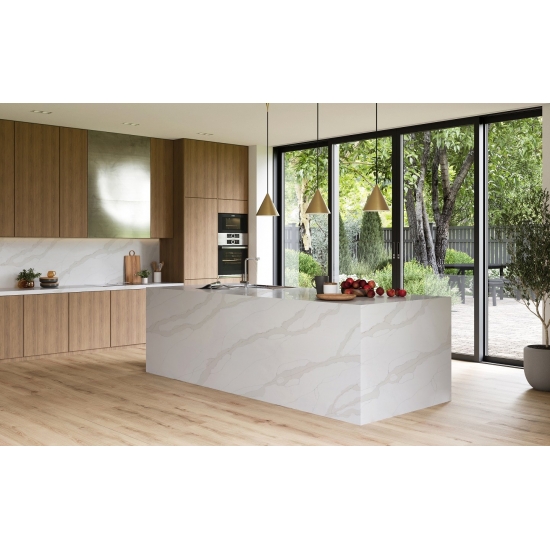 Die Calacatta-Serie ist derzeit das beliebteste Quarzsteinprodukt. Exquisit und einzigartig, besticht Calacatta-Quarz durch sein reines Weiß und die markante, durchgefärbte Marmoroptik. Mit seinem wunderschönen, breiten Adernmuster und der luxuriösen Haptik bietet dieser Quarz die natürliche Optik von Calacatta-Marmor, jedoch ohne dessen Nachteile. Calacatta-Quarz ist eine äußerst robuste, flecken- und kratzfeste Arbeitsplatte und somit eine sehr praktische Wahl für Küchen- und Badezimmerarbeitsplatten, Treppen, Fensterbänke, maßgefertigte Möbel, Wand- und Bodenbeläge im Innen- und Außenbereich, Wasserstrahlschneidtechniken und andere Designprojekte.