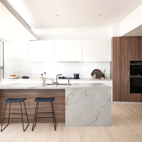 Calacatta-Quarz besteht aus natürlichen Bestandteilen, ist aber dennoch robust, langlebig und porenarm, wodurch Steinprodukte aus Quarz nahezu verschleißfrei sind. Langlebigkeit, Komfort und ein gleichmäßiges Muster sind die Hauptgründe für die wachsende Beliebtheit von Quarzstein. Quarzstein besteht zu 90 % aus Naturstein; der Rest sind Bindemittel, Farbstoffe und Zusatzstoffe, die die technischen Eigenschaften des Steins verbessern. Wasserdurchlässigkeit und Fleckenbeständigkeit ergänzen die Schönheit von Quarzstein.