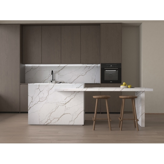 Dieser Quarz eignet sich perfekt für vielfältige Anwendungen, von Arbeitsplatten und Kücheninseln bis hin zu Akzentwänden und Waschtischen. Seine markante Maserung verleiht ihm Charakter und Eleganz und macht ihn zum Blickfang in jedem Design. Ob kombiniert mit edlen Metallic-Tönen oder warmen Holznuancen – der Quarz 5125 Calacatta Fiorina unterstreicht die Eleganz jedes Raumes.