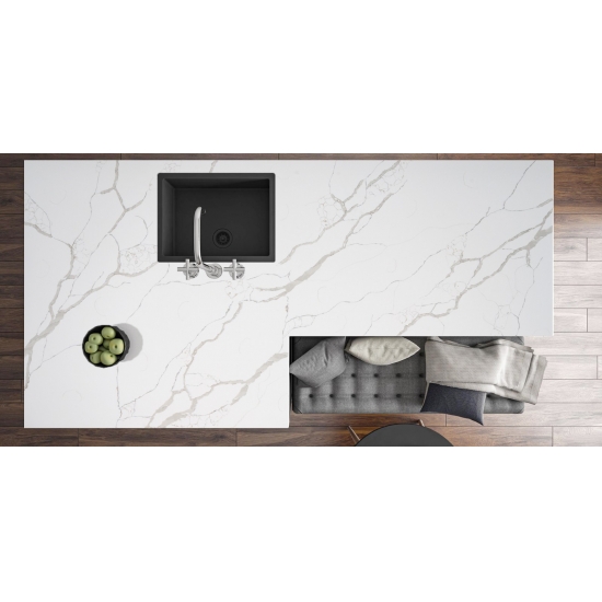 Calacatta-Quarz besteht aus natürlichen Bestandteilen, ist aber dennoch robust, langlebig und porenarm, wodurch Steinprodukte aus Quarz nahezu verschleißfrei sind. Langlebigkeit, Komfort und ein gleichmäßiges Muster sind die Hauptgründe für die wachsende Beliebtheit von Quarzstein. Quarzstein besteht zu 90 % aus Naturstein; der Rest sind Bindemittel, Farbstoffe und Zusatzstoffe, die die technischen Eigenschaften des Steins verbessern. Wasserdurchlässigkeit und Fleckenbeständigkeit ergänzen die Schönheit von Quarzstein.