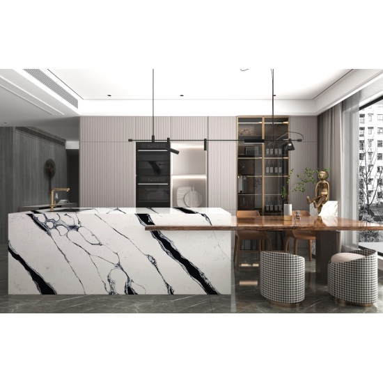 Calacatta-Quarz besteht aus natürlichen Bestandteilen, ist aber dennoch robust, langlebig und porenarm, wodurch Steinprodukte aus Quarz nahezu verschleißfrei sind. Langlebigkeit, Komfort und ein gleichmäßiges Muster sind die Hauptgründe für die wachsende Beliebtheit von Quarzstein. Quarzstein besteht zu 90 % aus Naturstein; der Rest sind Bindemittel, Farbstoffe und Zusatzstoffe, die die technischen Eigenschaften des Steins verbessern. Wasserdurchlässigkeit und Fleckenbeständigkeit ergänzen die Schönheit von Quarzstein.