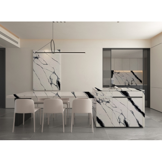Dieser Quarz eignet sich perfekt für vielfältige Anwendungen, von Arbeitsplatten und Kücheninseln bis hin zu Akzentwänden und Waschtischen. Seine markante Maserung verleiht ihm Charakter und Eleganz und macht ihn zum Blickfang in jedem Design. Ob kombiniert mit edlen Metallic-Tönen oder warmen Holznuancen – der Quarz 5125 Calacatta Fiorina unterstreicht die Eleganz jedes Raumes.
