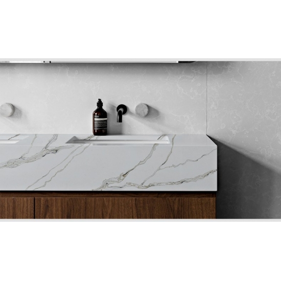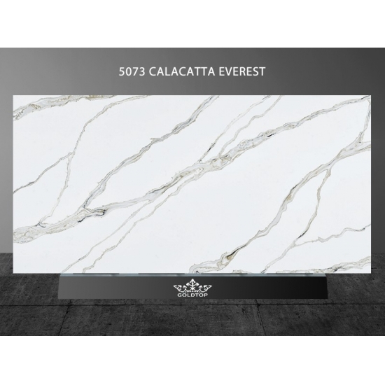 Die Quarzplatte 5073 Calacatta Everest präsentiert sich in einem markanten Weiß mit ausdrucksstarken grauen Adern. Dieser kraftvolle Kontrast erzeugt eine dynamische und luxuriöse Optik. Die Platte verkörpert majestätische Eleganz und setzt in jedem modernen Interieur stilvolle Akzente.