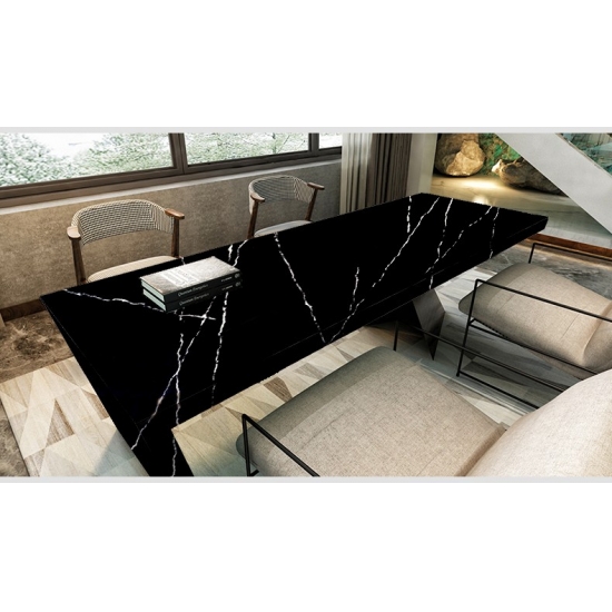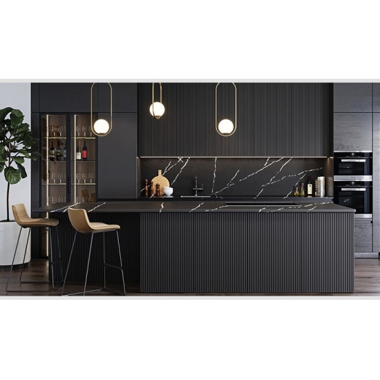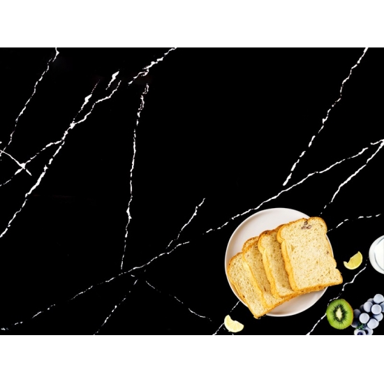 5074 Black Artwork besticht durch eine tiefschwarze Oberfläche, die durch markante weiße Adern eindrucksvoll in Szene gesetzt wird. Das kontrastreiche Muster erzeugt eine dynamische und künstlerische Wirkung. Diese Quarzplatte verkörpert modernen Luxus und setzt in jedem zeitgenössischen Interieur ein starkes Statement.