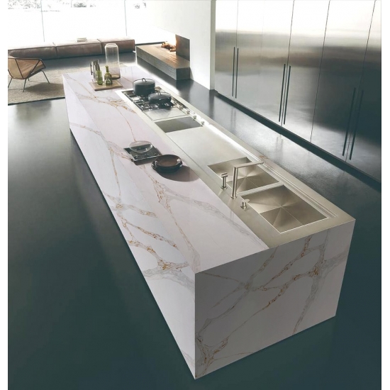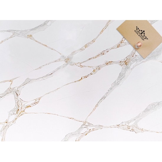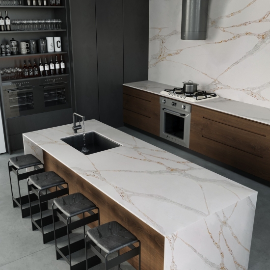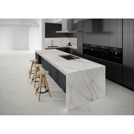 Die Calacatta-Serie ist derzeit das beliebteste Quarzsteinprodukt. Exquisit und einzigartig, besticht Calacatta-Quarz durch sein reines Weiß und die markante, durchgefärbte Marmoroptik. Mit seinem wunderschönen, breiten Adernmuster und der luxuriösen Haptik bietet dieser Quarz die natürliche Optik von Calacatta-Marmor, jedoch ohne dessen Nachteile. Calacatta-Quarz ist eine äußerst robuste, flecken- und kratzfeste Arbeitsplatte und somit eine sehr praktische Wahl für Küchen- und Badezimmerarbeitsplatten, Treppen, Fensterbänke, maßgefertigte Möbel, Wand- und Bodenbeläge im Innen- und Außenbereich, Wasserstrahlschneidtechniken und andere Designprojekte.