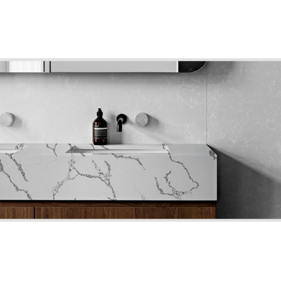 Die Quarzplatte 5077 Calacatta Vagli präsentiert sich mit einem strahlend weißen Grundton, der von kräftigen, tiefgrauen Adern durchzogen ist. Der markante Kontrast erzeugt eine beeindruckende Tiefenwirkung und dynamische Ausstrahlung. Diese Platte verkörpert modernen Luxus und eignet sich ideal, um in jedem zeitgenössischen Interieur einen atemberaubenden Blickfang zu schaffen.