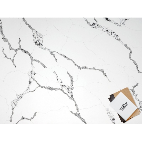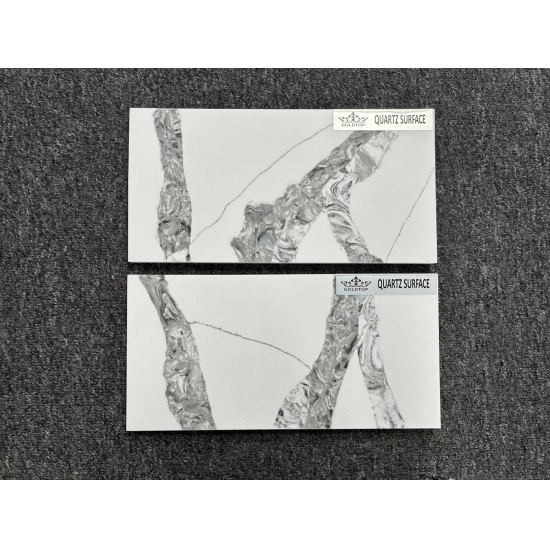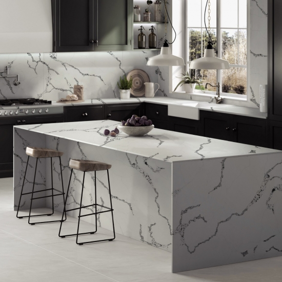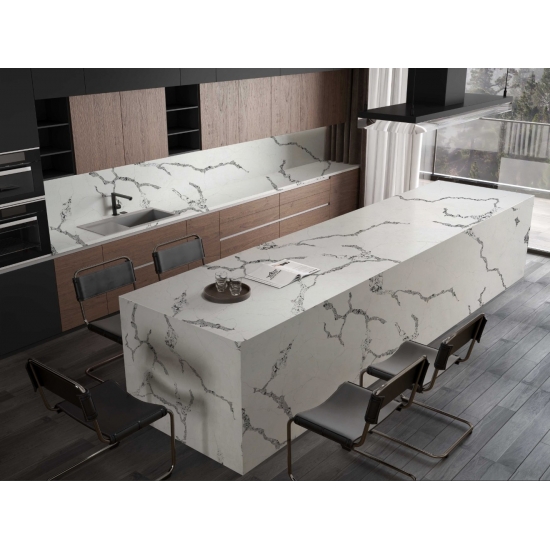 Die Calacatta-Serie ist derzeit das beliebteste Quarzsteinprodukt. Exquisit und einzigartig, besticht Calacatta-Quarz durch sein reines Weiß und die markante, durchgefärbte Marmoroptik. Mit seinem wunderschönen, breiten Adernmuster und der luxuriösen Haptik bietet dieser Quarz die natürliche Optik von Calacatta-Marmor, jedoch ohne dessen Nachteile. Calacatta-Quarz ist eine äußerst robuste, flecken- und kratzfeste Arbeitsplatte und somit eine sehr praktische Wahl für Küchen- und Badezimmerarbeitsplatten, Treppen, Fensterbänke, maßgefertigte Möbel, Wand- und Bodenbeläge im Innen- und Außenbereich, Wasserstrahlschneidtechniken und andere Designprojekte.