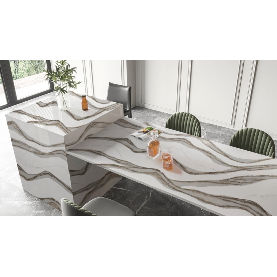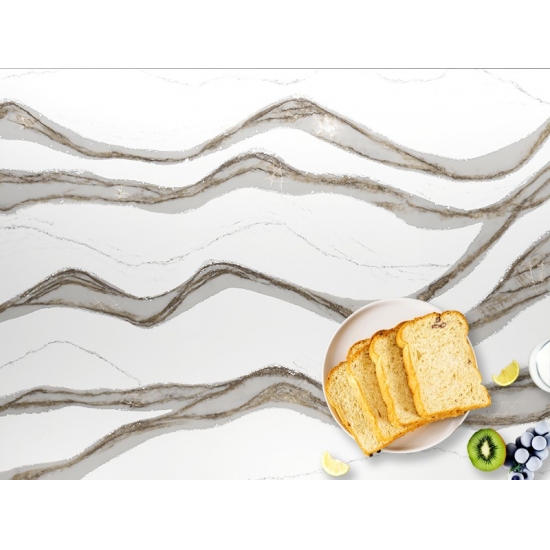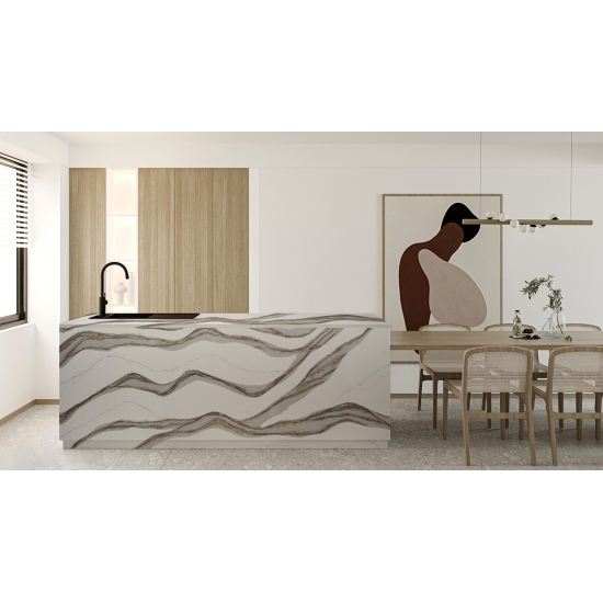 Der Quarzstein 5081 Skara Delicato besticht durch seine elegante Ausstrahlung. Sein sanftes Weiß, durchzogen von dezenten grauen Adern, verleiht ihm eine besondere Note. Inspiriert von der zeitlosen Schönheit natürlichen Marmors, vereint dieses Design die hohe Strapazierfähigkeit und Pflegeleichtigkeit von Quarz. Die feinen Adern fügen sich harmonisch in die Oberfläche ein und verleihen jedem Raum eine edle Note.