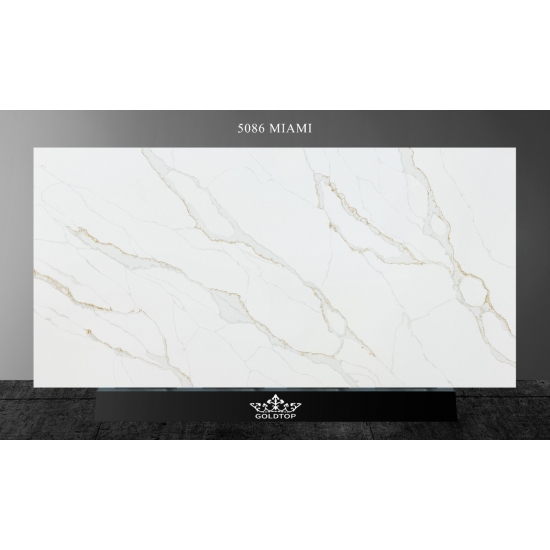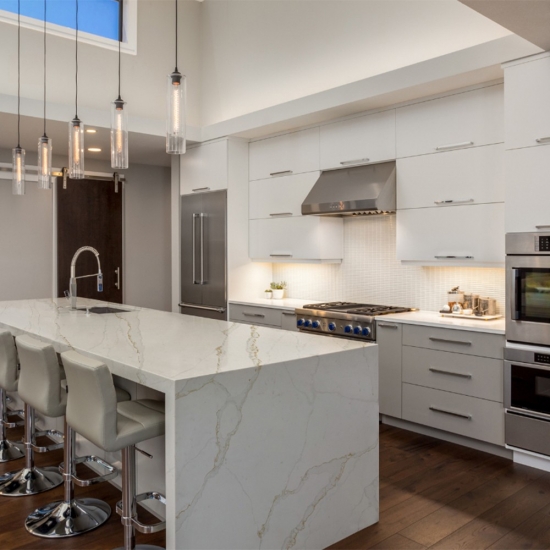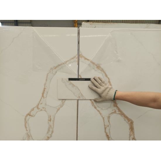 Die Calacatta-Serie ist derzeit das beliebteste Quarzsteinprodukt. Exquisit und einzigartig, besticht Calacatta-Quarz durch sein reines Weiß und die markante, durchgefärbte Marmoroptik. Mit seinem wunderschönen, breiten Adernmuster und der luxuriösen Haptik bietet dieser Quarz die natürliche Optik von Calacatta-Marmor, jedoch ohne dessen Nachteile. Calacatta-Quarz ist eine äußerst robuste, flecken- und kratzfeste Arbeitsplatte und somit eine sehr praktische Wahl für Küchen- und Badezimmerarbeitsplatten, Treppen, Fensterbänke, maßgefertigte Möbel, Wand- und Bodenbeläge im Innen- und Außenbereich, Wasserstrahlschneidtechniken und andere Designprojekte.