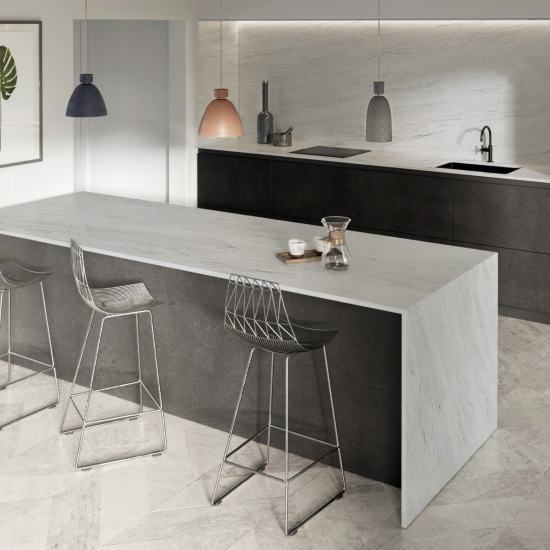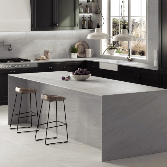 Exquisit und einzigartig: Calacatta-Quarz besticht durch sein reines Weiß und die markante, durchgefärbte Marmoroptik. Mit seinem wunderschönen, breiten Adernmuster und der luxuriösen Haptik bietet dieser Quarz die natürliche Optik von Calacatta-Marmor, jedoch ohne dessen Nachteile. Calacatta-Quarz ist eine äußerst robuste, flecken- und kratzfeste Arbeitsplatte und somit eine sehr praktische Wahl für Küchen- und Badezimmerarbeitsplatten, Treppen, Fensterbänke, maßgefertigte Möbel, Wand- und Bodenbeläge im Innen- und Außenbereich, Wasserstrahlschneidarbeiten und andere Designprojekte.
