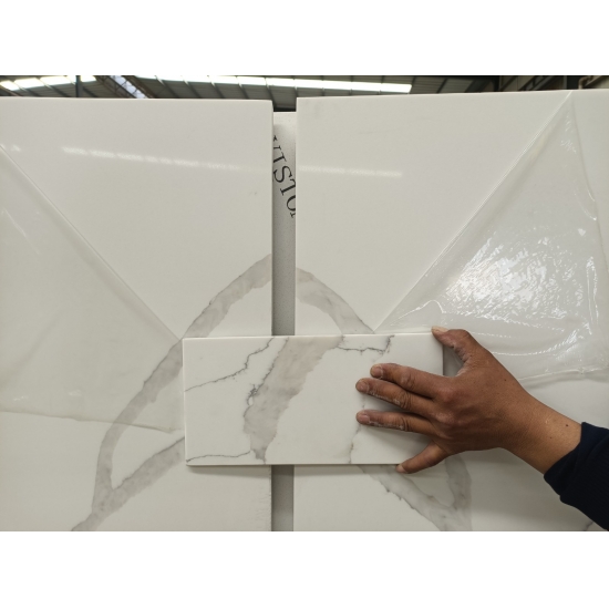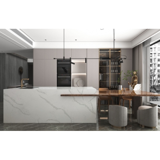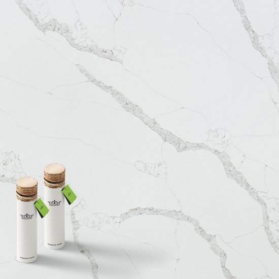 50 Square MetersExquisit und einzigartig: Calacatta-Quarz besticht durch sein reines Weiß und die markante, durchgefärbte Marmoroptik. Mit seinem wunderschönen, breiten Adernmuster und der luxuriösen Haptik bietet dieser Quarz die natürliche Optik von Calacatta-Marmor, jedoch ohne dessen Nachteile. Calacatta-Quarz ist eine äußerst robuste, flecken- und kratzfeste Arbeitsplatte und somit eine sehr praktische Wahl für Küchen- und Badezimmerarbeitsplatten, Treppen, Fensterbänke, maßgefertigte Möbel, Wand- und Bodenbeläge im Innen- und Außenbereich, Wasserstrahlschneidarbeiten und andere Designprojekte.