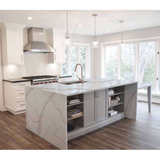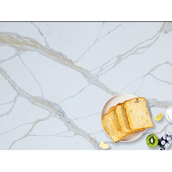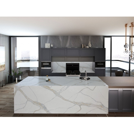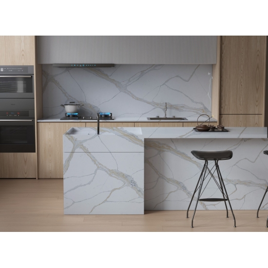 Die Calacatta-Serie ist derzeit das beliebteste Quarzsteinprodukt. Exquisit und einzigartig, besticht Calacatta-Quarz durch sein reines Weiß und die markante, durchgefärbte Marmoroptik. Mit seinem wunderschönen, breiten Adernmuster und der luxuriösen Haptik bietet dieser Quarz die natürliche Optik von Calacatta-Marmor, jedoch ohne dessen Nachteile. Calacatta-Quarz ist eine äußerst robuste, flecken- und kratzfeste Arbeitsplatte und somit eine sehr praktische Wahl für Küchen- und Badezimmerarbeitsplatten, Treppen, Fensterbänke, maßgefertigte Möbel, Wand- und Bodenbeläge im Innen- und Außenbereich, Wasserstrahlschneidtechniken und andere Designprojekte.