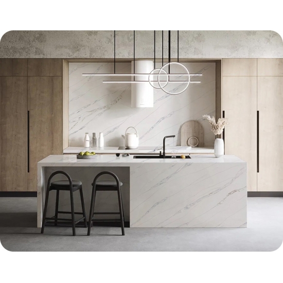 Die Calacatta-Serie ist derzeit das beliebteste Quarzsteinprodukt. Exquisit und einzigartig, besticht Calacatta-Quarz durch sein reines Weiß und die markante, durchgefärbte Marmoroptik. Mit seinem wunderschönen, breiten Adernmuster und der luxuriösen Haptik bietet dieser Quarz die natürliche Optik von Calacatta-Marmor, jedoch ohne dessen Nachteile. Calacatta-Quarz ist eine äußerst robuste, flecken- und kratzfeste Arbeitsplatte und somit eine sehr praktische Wahl für Küchen- und Badezimmerarbeitsplatten, Treppen, Fensterbänke, maßgefertigte Möbel, Wand- und Bodenbeläge im Innen- und Außenbereich, Wasserstrahlschneidtechniken und andere Designprojekte.