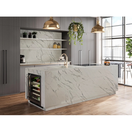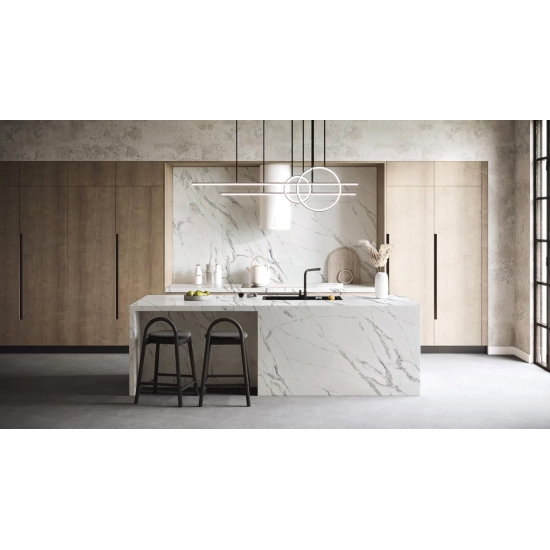 Exquisit und einzigartig: Calacatta-Quarz besticht durch sein reines Weiß und die markante, durchgefärbte Marmoroptik. Mit seinem wunderschönen, breiten Adernmuster und der luxuriösen Haptik bietet dieser Quarz die natürliche Optik von Calacatta-Marmor, jedoch ohne dessen Nachteile. Calacatta-Quarz ist eine äußerst robuste, flecken- und kratzfeste Arbeitsplatte und somit eine sehr praktische Wahl für Küchen- und Badezimmerarbeitsplatten, Treppen, Fensterbänke, maßgefertigte Möbel, Wand- und Bodenbeläge im Innen- und Außenbereich, Wasserstrahlschneidarbeiten und andere Designprojekte.