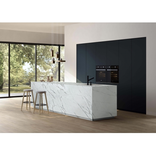 Der Quarz 5121 Milan Extra Calacatta Gold besticht durch seine markante, ausdrucksstarke Optik. Sein tiefschwarzer Hintergrund ist von feinen, schimmernden Partikeln durchzogen. Die Oberfläche strahlt Eleganz aus, denn die dunklen Töne bilden einen Kontrast zu den subtilen Sprenkeln, die das Licht einfangen und so Tiefe und Dynamik erzeugen. Dieser Quarz setzt ein Statement und verleiht jedem Raum einen Hauch von Opulenz.