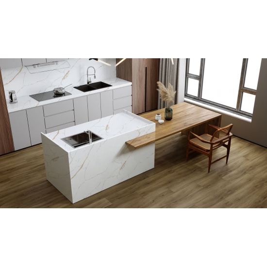 Die Calacatta-Serie ist derzeit das beliebteste Quarzsteinprodukt. Exquisit und einzigartig, besticht Calacatta-Quarz durch sein reines Weiß und die markante, durchgefärbte Marmoroptik. Mit seinem wunderschönen, breiten Adernmuster und der luxuriösen Haptik bietet dieser Quarz die natürliche Optik von Calacatta-Marmor, jedoch ohne dessen Nachteile. Calacatta-Quarz ist eine äußerst robuste, flecken- und kratzfeste Arbeitsplatte und somit eine sehr praktische Wahl für Küchen- und Badezimmerarbeitsplatten, Treppen, Fensterbänke, maßgefertigte Möbel, Wand- und Bodenbeläge im Innen- und Außenbereich, Wasserstrahlschneidtechniken und andere Designprojekte.