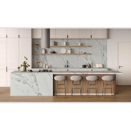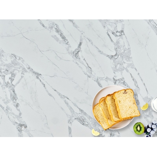 Exquisit und einzigartig: Calacatta-Quarz besticht durch sein reines Weiß und die markante, durchgefärbte Marmoroptik. Mit seinem wunderschönen, breiten Adernmuster und der luxuriösen Haptik bietet dieser Quarz die natürliche Optik von Calacatta-Marmor, jedoch ohne dessen Nachteile. Calacatta-Quarz ist eine äußerst robuste, flecken- und kratzfeste Arbeitsplatte und somit eine sehr praktische Wahl für Küchen- und Badezimmerarbeitsplatten, Treppen, Fensterbänke, maßgefertigte Möbel, Wand- und Bodenbeläge im Innen- und Außenbereich, Wasserstrahlschneidarbeiten und andere Designprojekte.