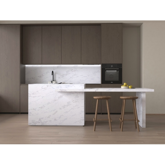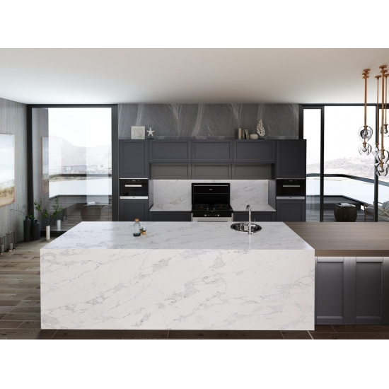 Exquisit und einzigartig: Calacatta-Quarz besticht durch sein reines Weiß und die markante, durchgefärbte Marmoroptik. Mit seinem wunderschönen, breiten Adernmuster und der luxuriösen Haptik bietet dieser Quarz die natürliche Optik von Calacatta-Marmor, jedoch ohne dessen Nachteile. Calacatta-Quarz ist eine äußerst robuste, flecken- und kratzfeste Arbeitsplatte und somit eine sehr praktische Wahl für Küchen- und Badezimmerarbeitsplatten, Treppen, Fensterbänke, maßgefertigte Möbel, Wand- und Bodenbeläge im Innen- und Außenbereich, Wasserstrahlschneidarbeiten und andere Designprojekte.