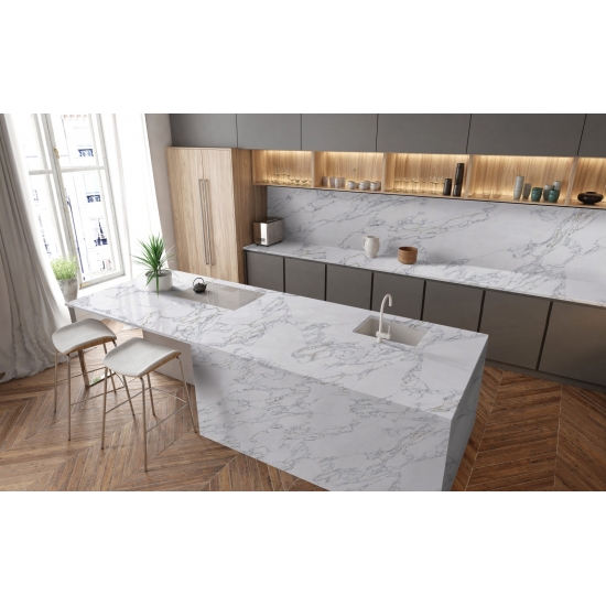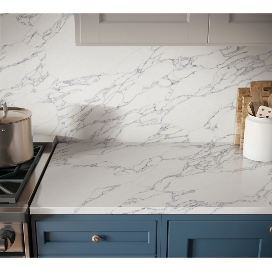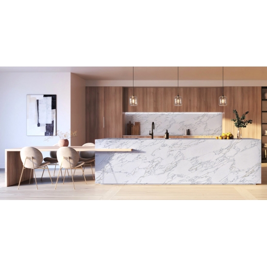 Exquisit und einzigartig: Calacatta-Quarz besticht durch sein reines Weiß und die markante, durchgefärbte Marmoroptik. Mit seinem wunderschönen, breiten Adernmuster und der luxuriösen Haptik bietet dieser Quarz die natürliche Optik von Calacatta-Marmor, jedoch ohne dessen Nachteile. Calacatta-Quarz ist eine äußerst robuste, flecken- und kratzfeste Arbeitsplatte und somit eine sehr praktische Wahl für Küchen- und Badezimmerarbeitsplatten, Treppen, Fensterbänke, maßgefertigte Möbel, Wand- und Bodenbeläge im Innen- und Außenbereich, Wasserstrahlschneidarbeiten und andere Designprojekte.