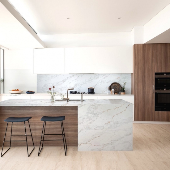 Exquisit und einzigartig: Calacatta-Quarz besticht durch sein reines Weiß und die markante, durchgefärbte Marmoroptik. Mit seinem wunderschönen, breiten Adernmuster und der luxuriösen Haptik bietet dieser Quarz die natürliche Optik von Calacatta-Marmor, jedoch ohne dessen Nachteile. Calacatta-Quarz ist eine äußerst robuste, flecken- und kratzfeste Arbeitsplatte und somit eine sehr praktische Wahl für Küchen- und Badezimmerarbeitsplatten, Treppen, Fensterbänke, maßgefertigte Möbel, Wand- und Bodenbeläge im Innen- und Außenbereich, Wasserstrahlschneidarbeiten und andere Designprojekte.