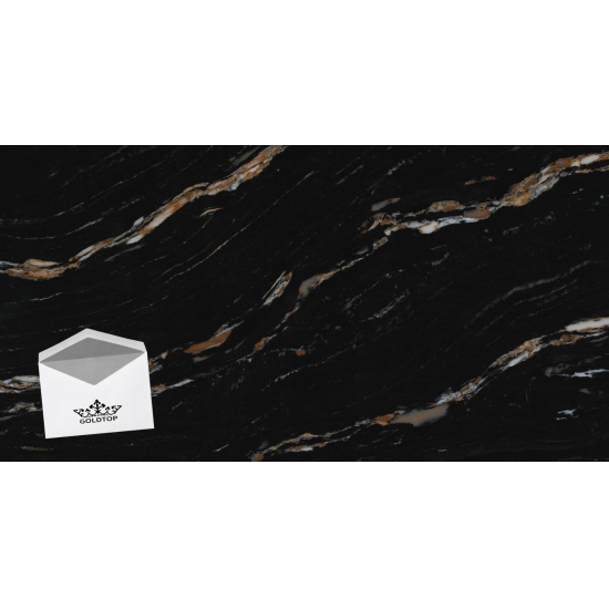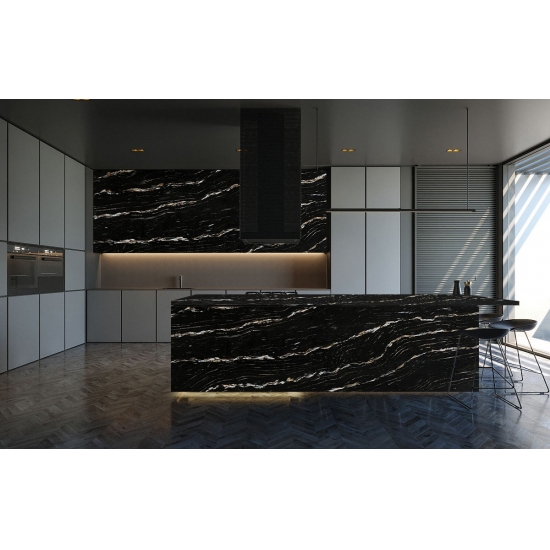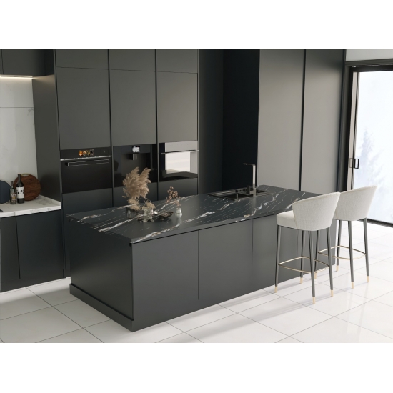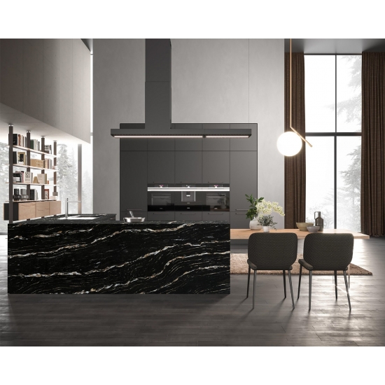 Der Quarz 5121 Milan Extra Calacatta Gold besticht durch seine markante, ausdrucksstarke Optik. Sein tiefschwarzer Hintergrund ist von feinen, schimmernden Partikeln durchzogen. Die Oberfläche strahlt Eleganz aus, denn die dunklen Töne bilden einen Kontrast zu den subtilen Sprenkeln, die das Licht einfangen und so Tiefe und Dynamik erzeugen. Dieser Quarz setzt ein Statement und verleiht jedem Raum einen Hauch von Opulenz.