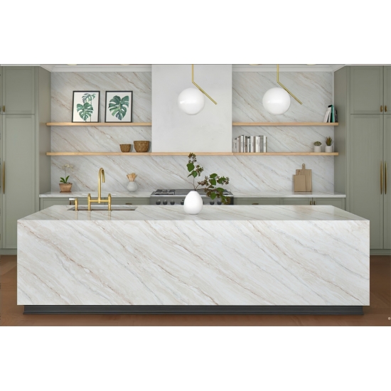 Die Calacatta-Serie ist derzeit das beliebteste Quarzsteinprodukt. Exquisit und einzigartig, besticht Calacatta-Quarz durch sein reines Weiß und die markante, durchgefärbte Marmoroptik. Mit seinem wunderschönen, breiten Adernmuster und der luxuriösen Haptik bietet dieser Quarz die natürliche Optik von Calacatta-Marmor, jedoch ohne dessen Nachteile. Calacatta-Quarz ist eine äußerst robuste, flecken- und kratzfeste Arbeitsplatte und somit eine sehr praktische Wahl für Küchen- und Badezimmerarbeitsplatten, Treppen, Fensterbänke, maßgefertigte Möbel, Wand- und Bodenbeläge im Innen- und Außenbereich, Wasserstrahlschneidtechniken und andere Designprojekte.